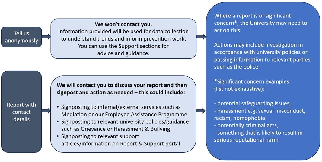 When you report an incident, there is no pressure for you to formally report anything. However, if the matter is of significant concern, the university may need to take appropriate action. Click anywhere on the image to enlarge:What happens when I make a report - quick guideI am reporting anonymously